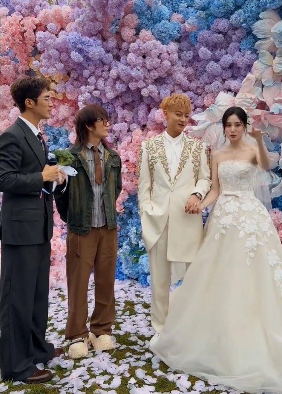 直播中,两位新人的家人、朋友、工作伙伴都在现场共襄盛举,刘些宁、麦迪娜、谢可寅、谢彬彬、代露娃、孙如云、姜潮等艺人朋友也都出了镜。不过,此前自媒体博主盛传的“鹿晗、张艺兴”等嘉宾,并未出现在下午的活动中。